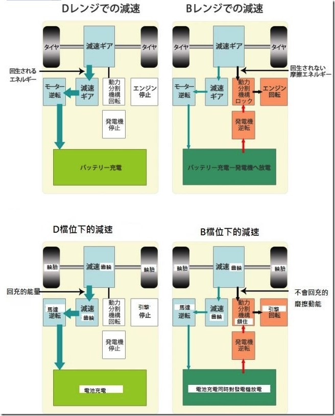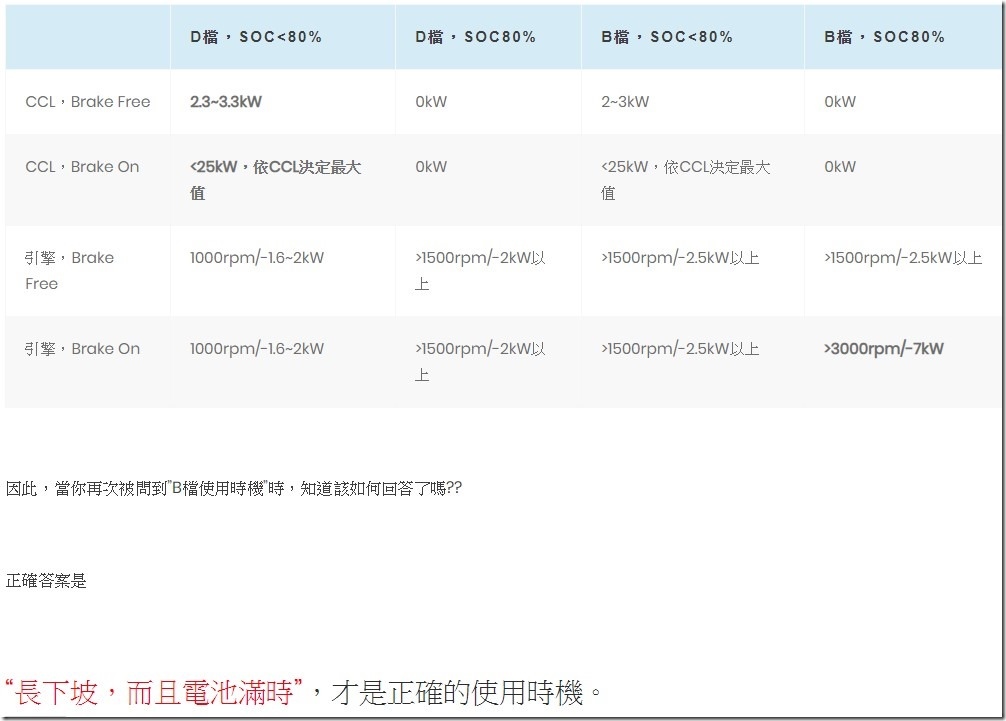 2.當電池充飽後動能回收效果也停止(防止過充),動能回充剎車效果沒了,這時要排入B擋靠引擎剎車來減緩長下坡的車速,以防止一直踩剎車造成煞車系統過熱出現無法剎車安全問題。