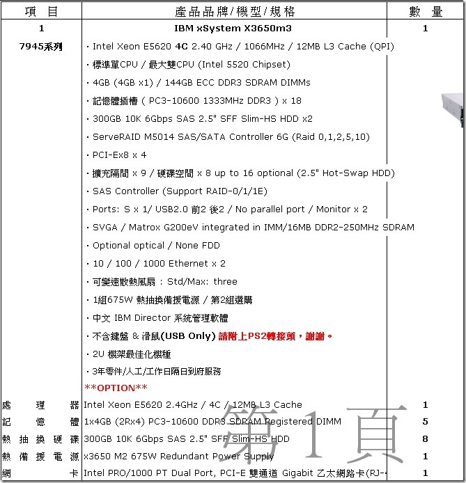 IBM 3650 M3 系列,這次的規格: